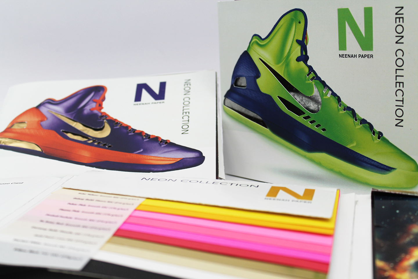 This project was created as a promotional piece for Neenah Paper. I chose to create a Neenah Paper Swathbook series designed after Kevin Durant’s Nike KD Five sneakers. My swatchbook highlighted the neon colors of Neenah Paper and Kevin Durant’s sneakers, which were a perfect fit for the futuristic theme I was going for. We had to include two finishes and two forms of binding. I used foil stamps and friskit for the finishes and saddle stitch and side wire for the binding.